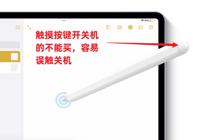 近期买了一支iPad国产平替电容笔,用了半天,发现了明显的设计缺陷。这支笔在笔帽的位置设计了触摸按键,只要按一下就开机,再按一下就关机